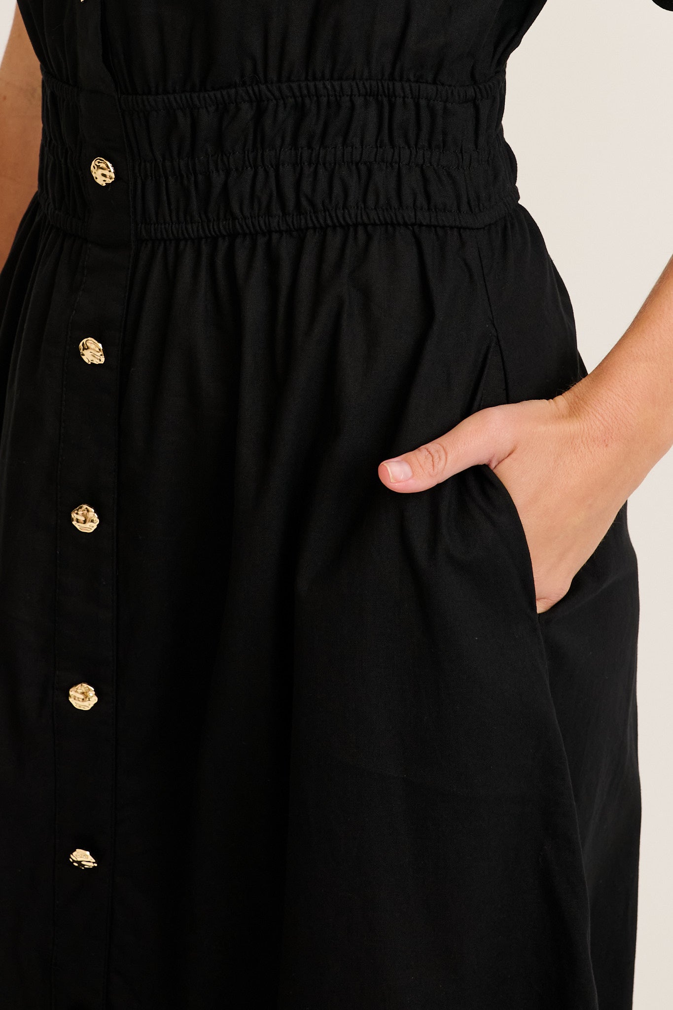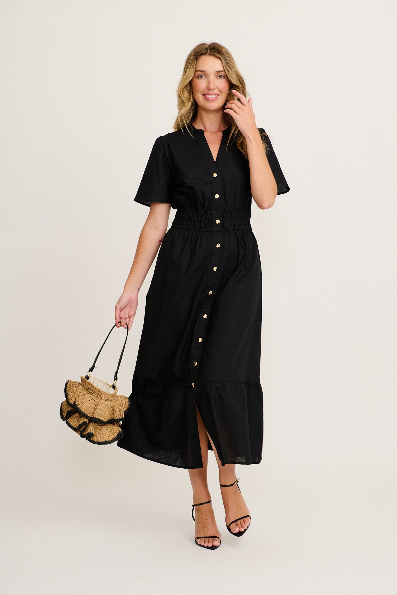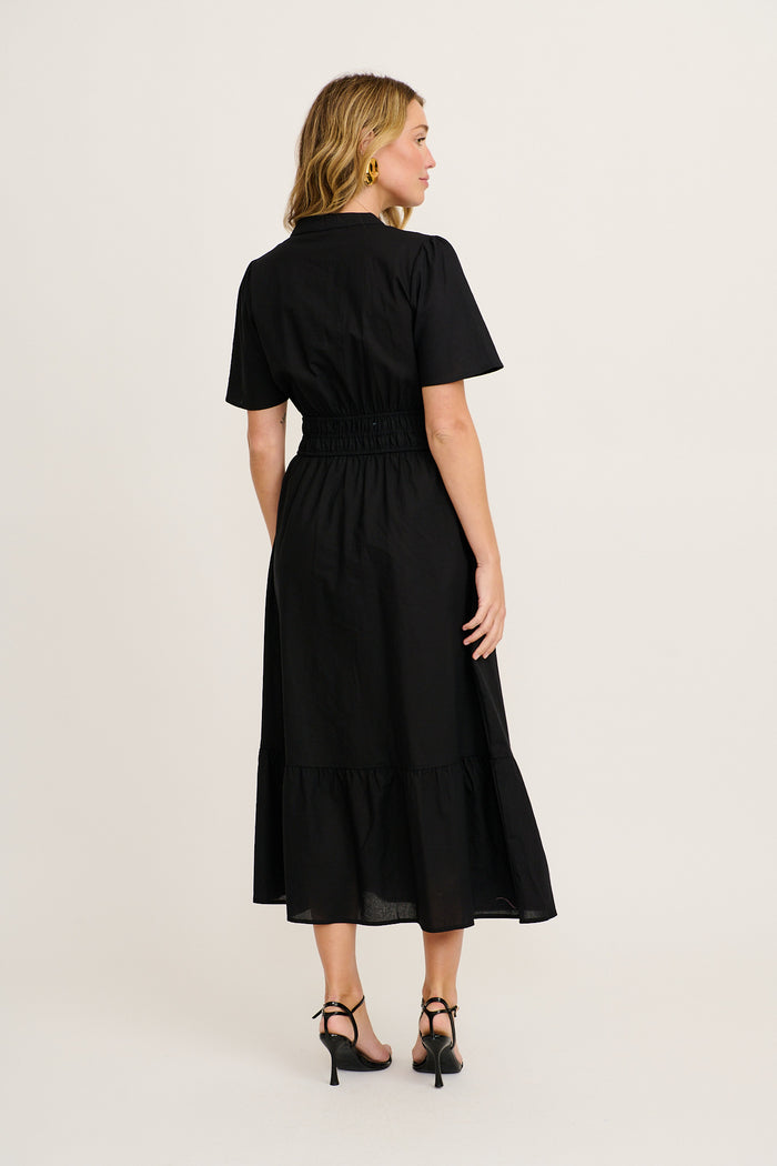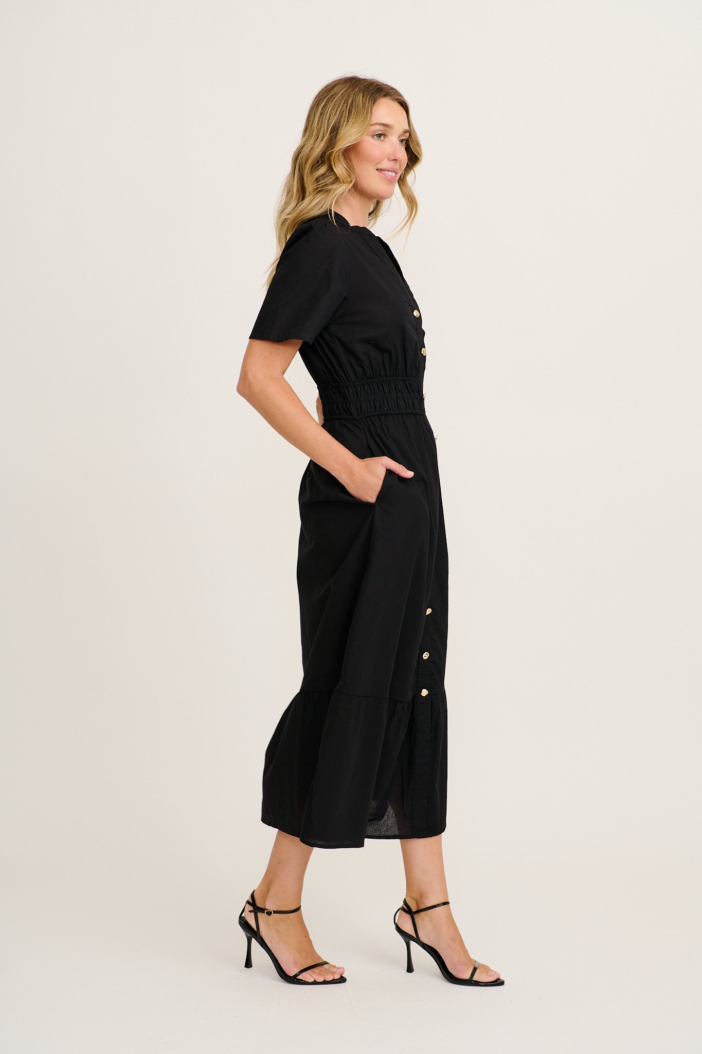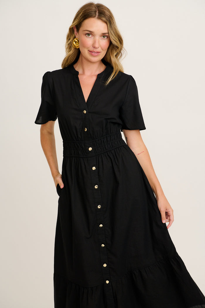 Made from lightweight, breathable 100% cotton, this midi dress features a classic V‑neckline with a Mandarin collar, textured metal buttons down the front, and an encased elasticised waist that gently defines your shape. The tiered skirting adds soft movement and ease, while hidden pockets bring practicality to a refined design. And yes — it’s breastfeeding‑friendly too.