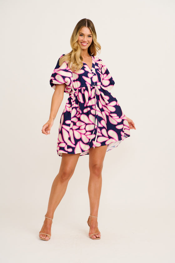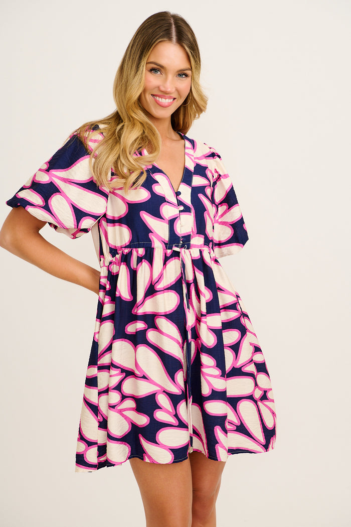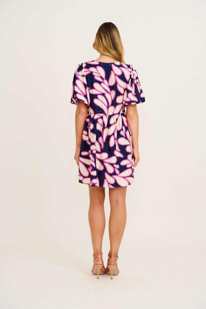 Sunbeam Dress in Navy with Pink Print Linen Blend