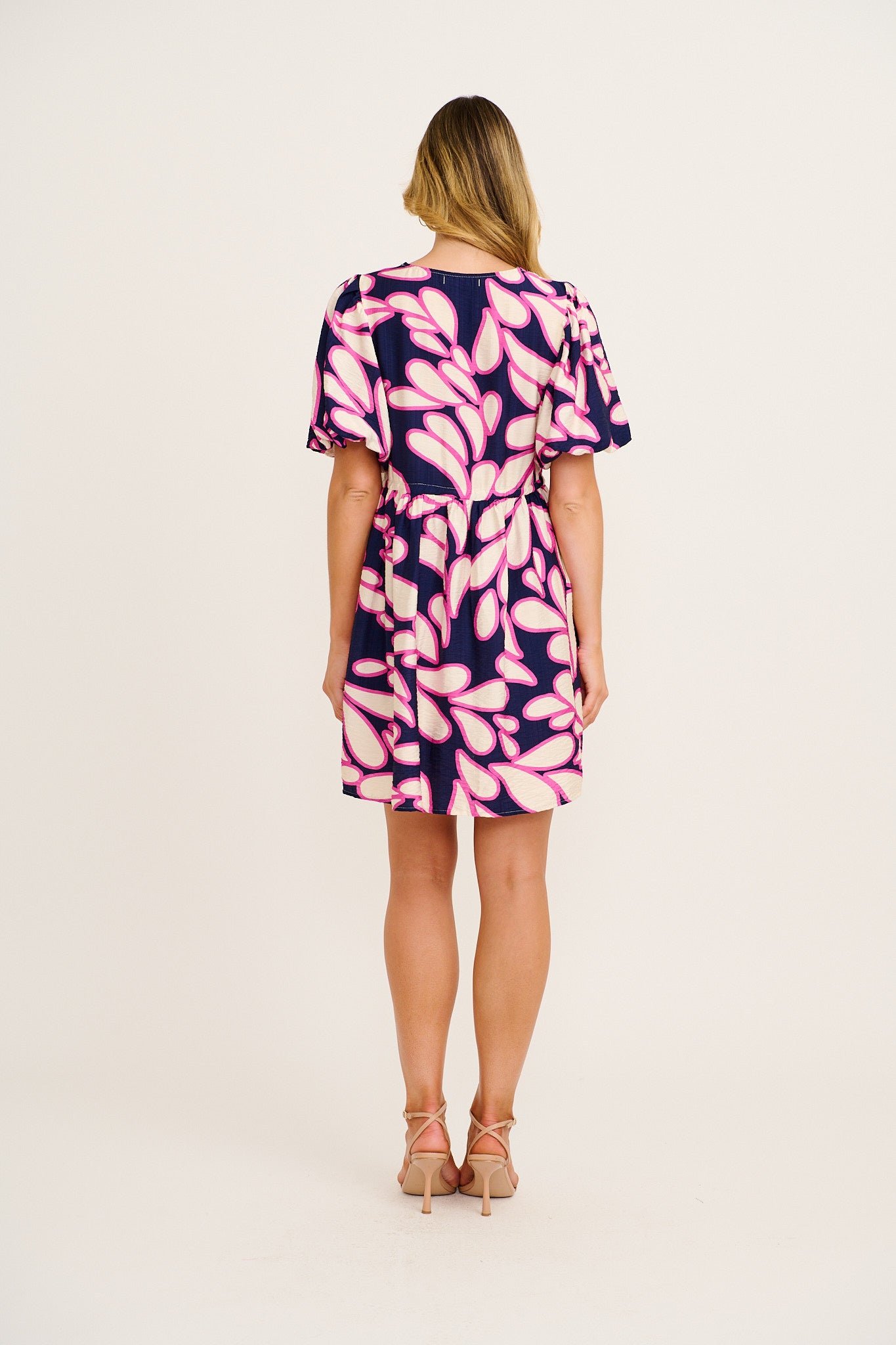 This style is made from a breathable rayon-linen blend and features a self-button front with loop closures, a drawstring waist with silver toggle, and soft puff sleeves. The above-knee cut makes it easy for everyday wear, while the lightweight sleeve lining adds just the right amount of coverage.